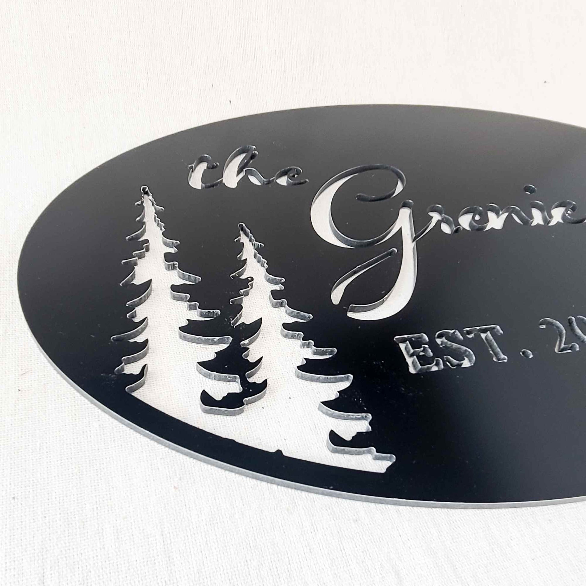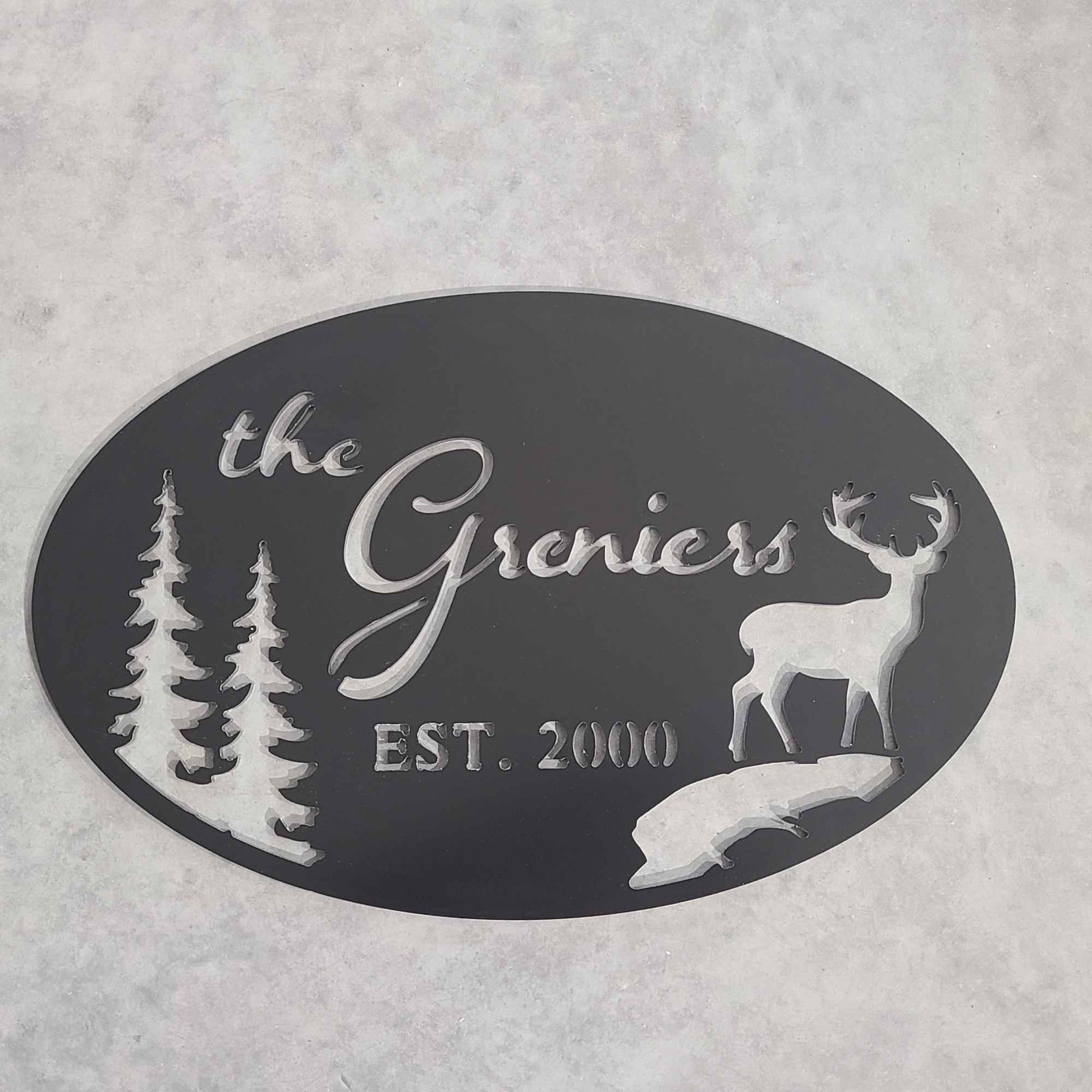 Personalized Last Name Oval Sign with evergreen trees and deer • Farm, Cabin, Lake House Address Plaque